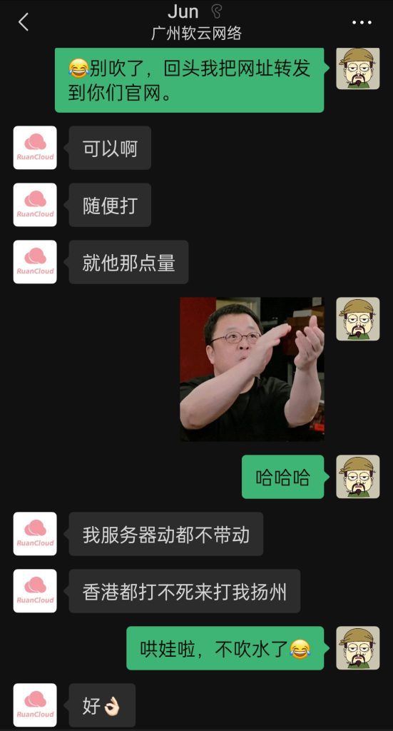 大家可以通过博友们的AfF链接购买,”https://ruan.cloud/activity.html?laozhang“这样推荐的人也可以获得一份收益。流量和钱可以内部消化一下,我是通过老张博客链接购买的,这里还是放老张博客的购买链接。软云没给我广告费,也没给我赞助主机,硬要说利益相关。Jun兄帮我解决了一些问题,我希望还一个人情,这就是我和软云Jun的二三事。聊天记录只是一部分,实际上差不多有十几页的聊天内容,这哥们这能聊啊,哈哈哈。