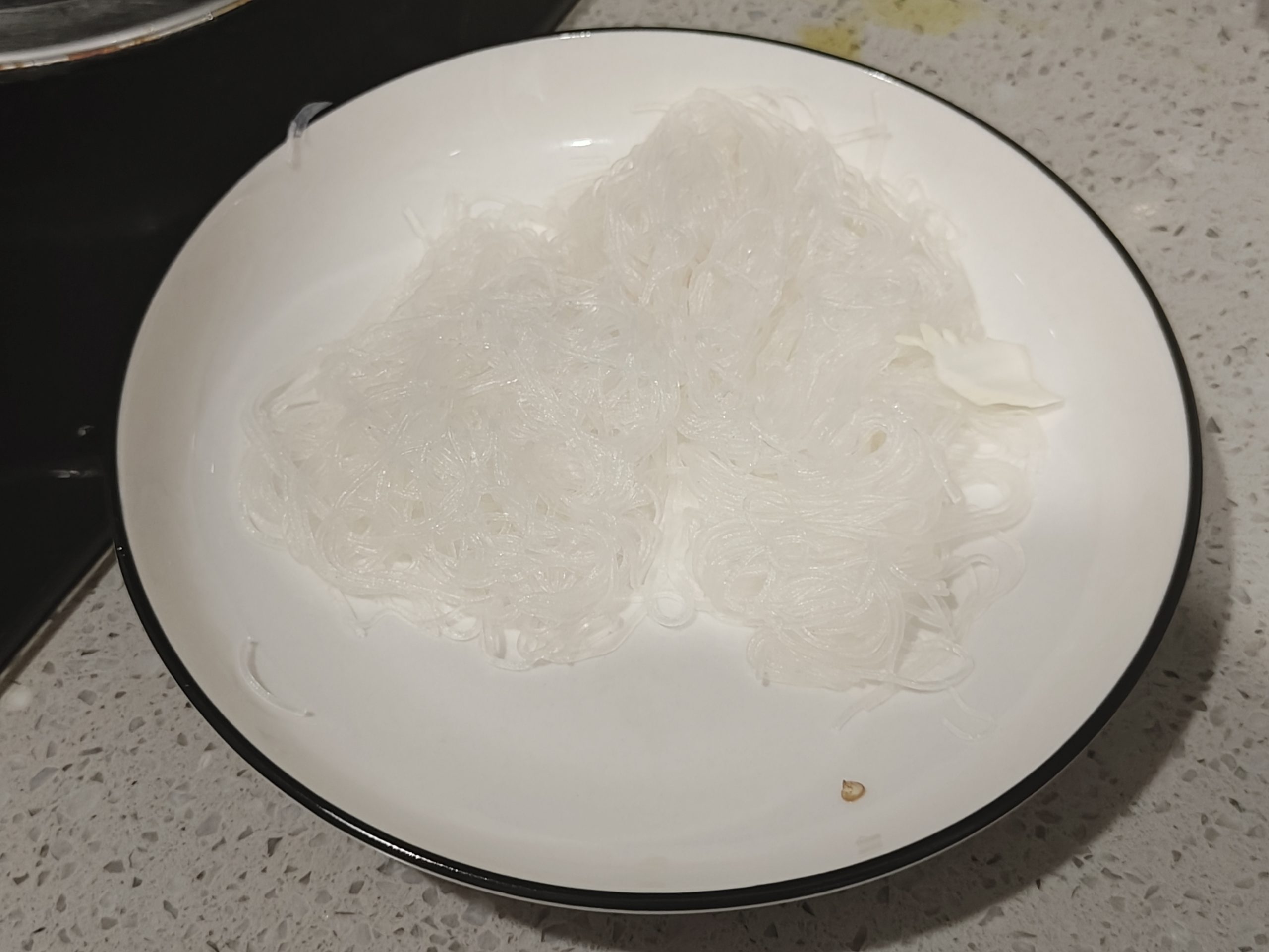 步骤2:粉丝煮开,剪成两段,太长不太方便吃。