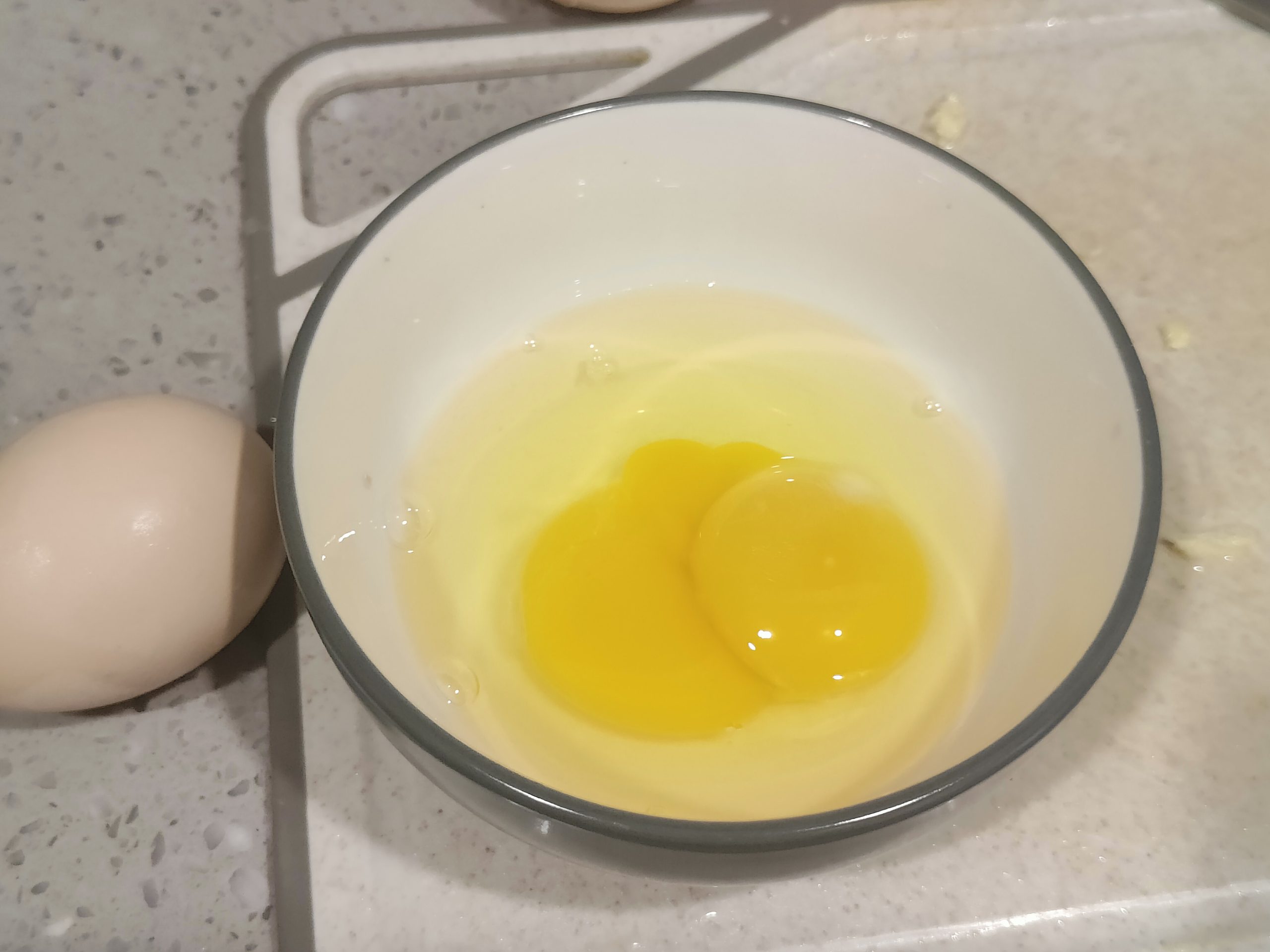 步骤4:鸡蛋打碎搅拌备用,打到一个双黄蛋。