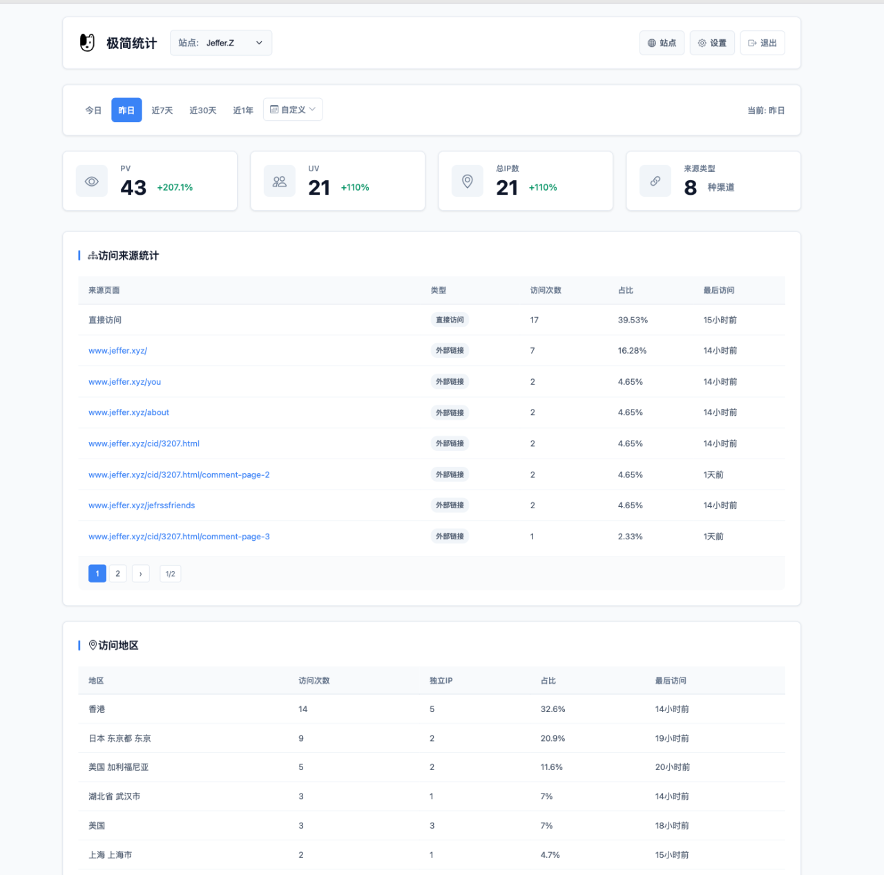 如果你有多个网站,也不用分别装统计系统。一个 JefCounts 可以管理多个站点,在一个后台就能看所有网站的数据,,我设计的界面是OnePage的思路,所有都在这个界面上,你查看数据就是直接在上面查看,不做复杂交互,不做无用的功能。